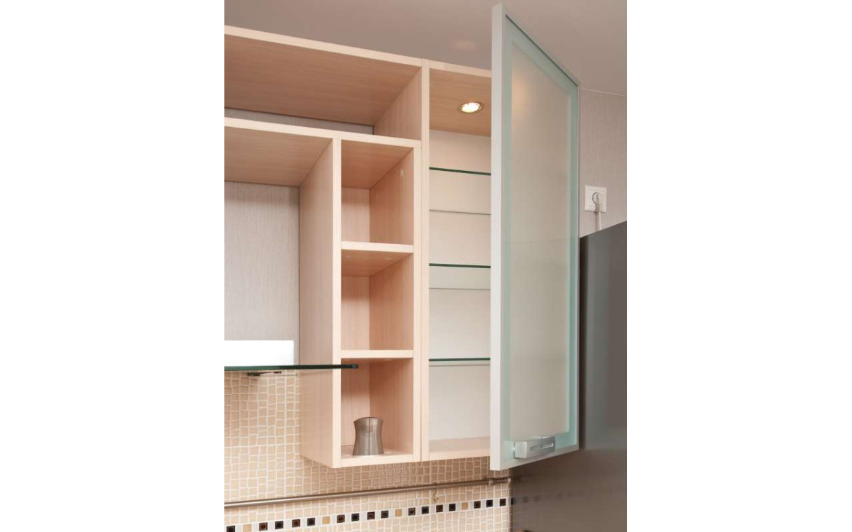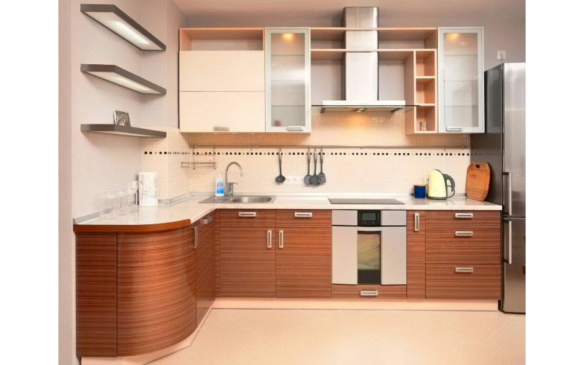 Вместительная уютная и гостеприимная кухня в стиле модерн. Фасады из МДФ, покрыты глянцевой пленкой ПВХ с текстурой дерева внизу, и светлые тона в верхних модулях. Множество оригинальных открытых полок и стекла в алюминиевом профиле, подъемные механизмы и карго, интегрированная подсветка и столешница под камень создают атмосферу дома, в котором всегда ждут гостей. Если Вы давно искали кухню, в которой хочется испытывать подобные эмоции, то этот кухонный гарнитур именно ваш. А использование надежной фурнитуры Rejs и Blum, обеспечат вам длительный срок службы и комфортную работу.