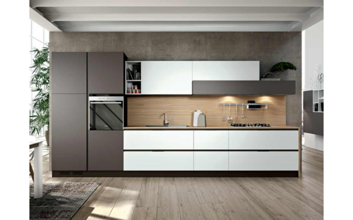 Современная прямая кухня, с встроенным холодильником , встроенной вытяжкой и духовым шкафом в пенале, выглядит очень стильно и оригинально благодаря контрастному сочетанию цветов фасадов. Фасады, выполнены из крашеного МДФ и имеют гладкую матовую фактуру, что выгодно сочетается с деревянным декором столешницы и стеновой панели и подчеркивается встроенным освещением. Отсутствие ручек и размещение нижних фасадов в два ряда, в сочетании, а ассиметричным верхом придает этому гарнитуру оригинальности и неповторимости.
