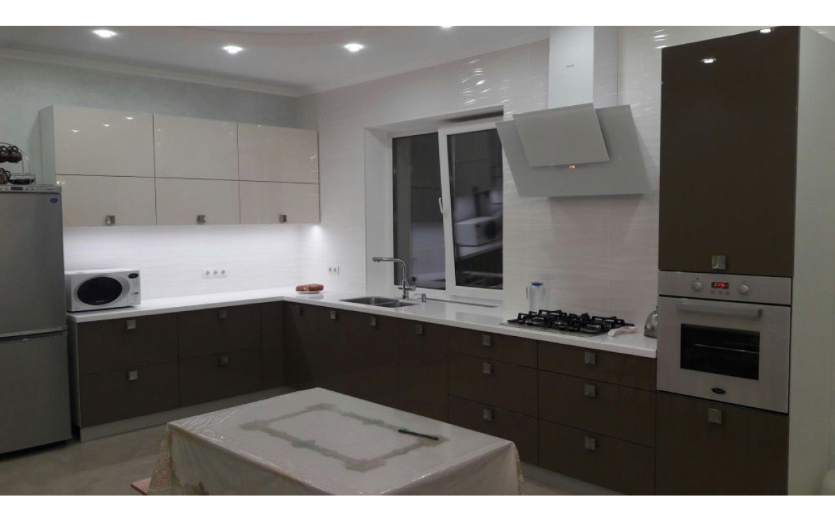 Большая угловая кухня с оригинальным сочетанием матовых и глянцевых текстур, крашенных МДФ фасадов с столешницей из искусственного камня, плавно переходящей в подоконник. Очень оригинальный кухонный гарнитур, с большим количеством естественного и искусственного света благодаря органично обыгранному окну и дополнительным освещение под верхними модулями. Верхние модули оснащены подъемными механизмами Hafele, а нижние тумбы – выдвижными ящиками скрытого монтажа Linken с доводчиками. Все это, выделяет эту кухню и делает ее очень удобной и практичной.