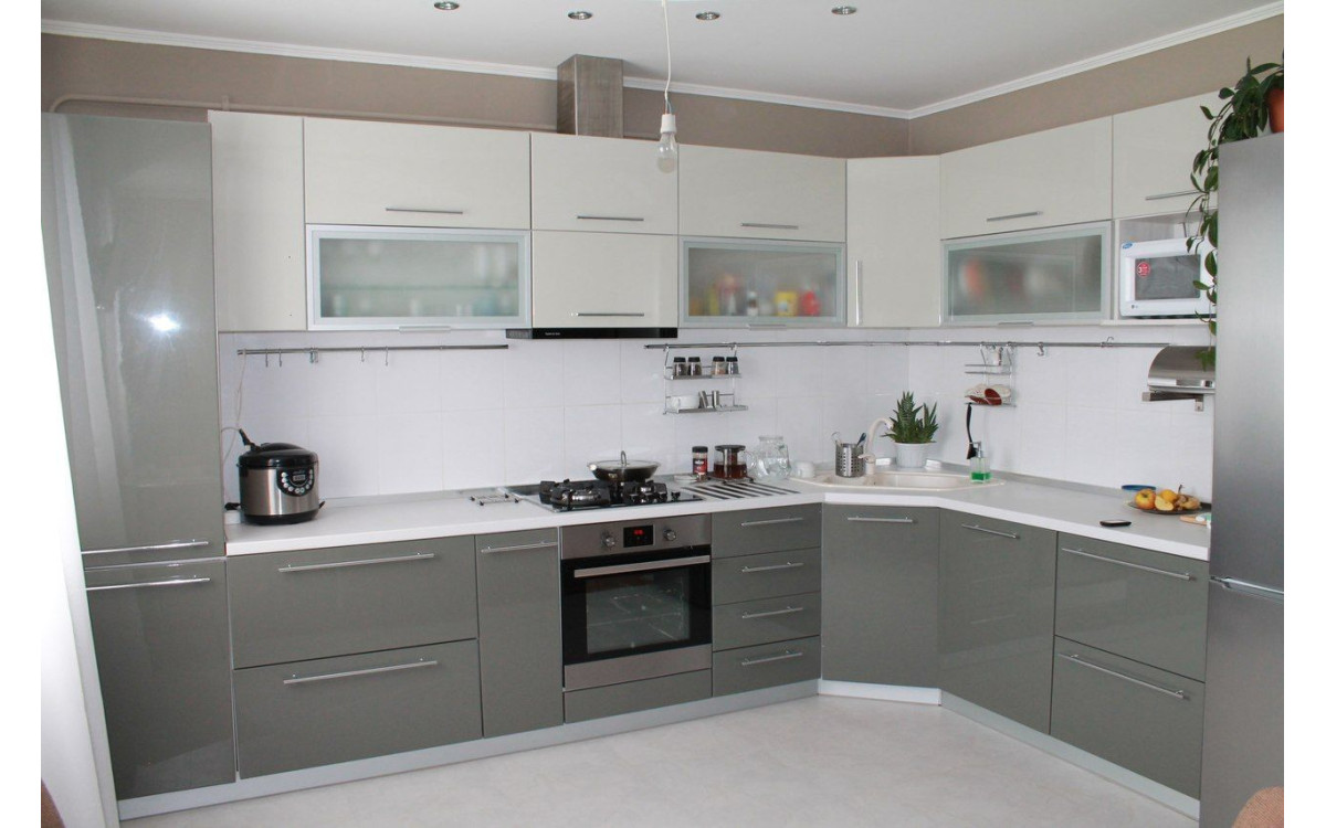 Светлый кухонный гарнитур с столешницей из искусственного камня в стиле модерн. Большая и вместительная современная кухня с глянцевыми фасадами и матовыми стеклами. Большое количество выдвижных ящиков, наличие карго и подъемников делают ее максимально комфортной и функциональной.