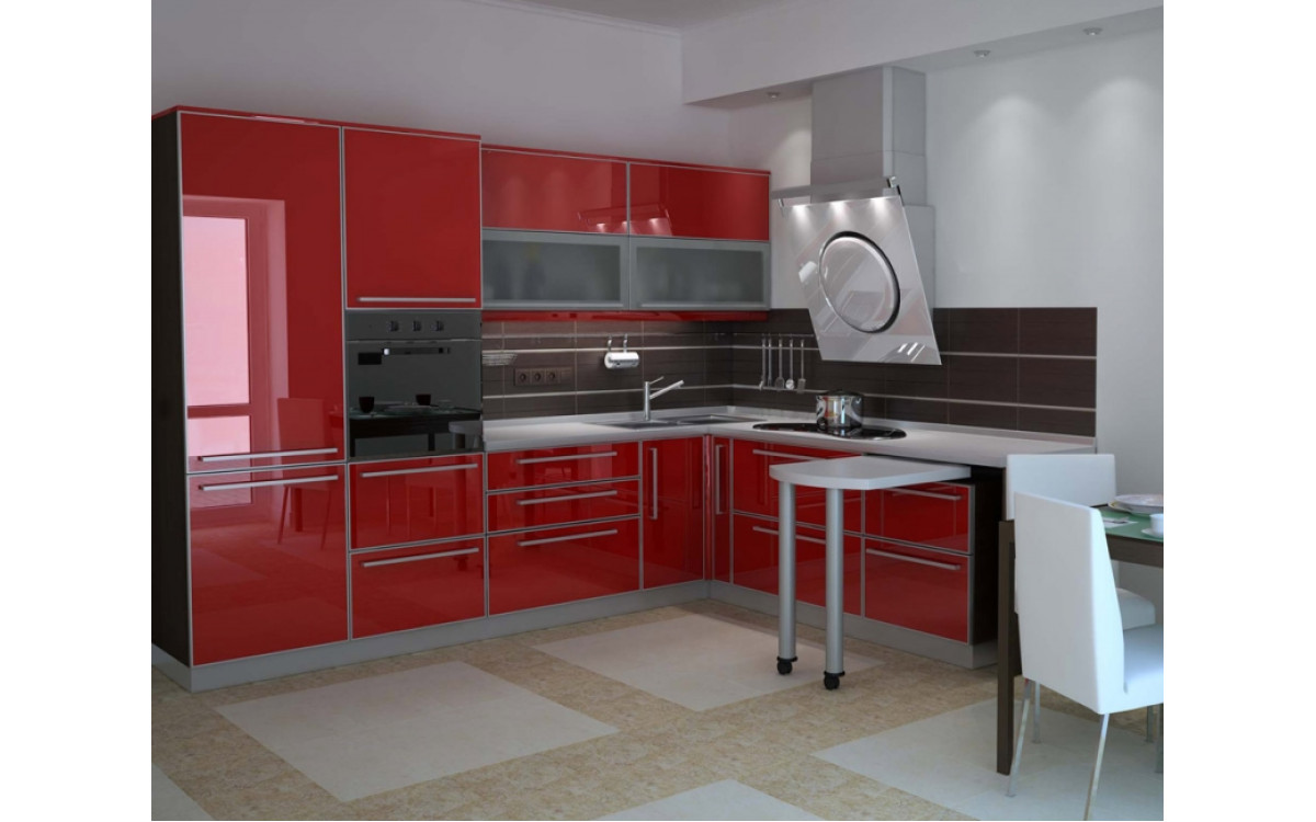 Правильные геометрические линии, отсутствие лишнего дополнительного декора, глянцевая поверхность пластика с алюминиевой окантовкой в сочетании матовыми стеклами и выдвижной столик, создают неповторимый и оригинальный образ этого ультрасовременного кухонного гарнитура. А обилие подъемных механизмов и наличие карго, несомненно добавят комфорта при использовании.