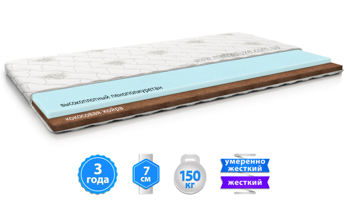 - Наполнение:Чехол – стеганый жаккард Пенополиуретан высокой плотности Латексированная кокосовая койра Чехол – стеганый жаккард