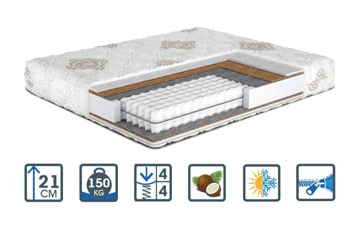 - Наполнение:Чехол съемный - стрейч-жаккард глубокой прошивки Прошивка чехла - шерсть 100% Termofelt - органический материал Кокосовая койра Termofiber Усиленный блок независимых пружин Pocket Spring с металлической рамкой в двухспальных моделях Termofiber Кокосовая койра Termofelt - органический материал Прошивка чехла - хлопок 100 % Чехол съемный - стрейч-жаккард глубокой прошивки