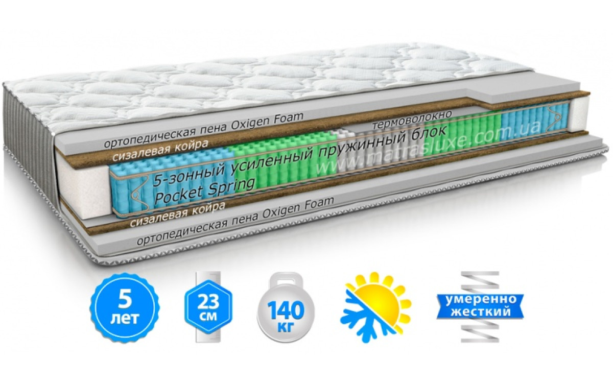 - Наполнение:Чехол - стрейч жаккард глубокой прошивки Прошивка чехла – хлопок 100 % Oxygen Foam Сизаль Termofiber 5 зонный пружинный блок Pocket Spring с усилением двумя рамками из стали Termofiber Сизаль Oxygen Foam Прошивка чехла – шерсть 100% Чехол - стрейч жаккард глубокой прошивки