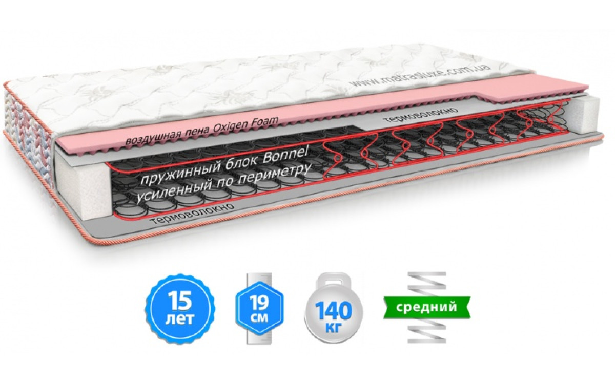 - Наполнение:Чехол - стрейч-жаккард глубокой прошивки Oxigen Foam Termofiber Пружинный блок Bonnel с усилением Termofiber Чехол - стрейч-жаккард глубокой прошивки