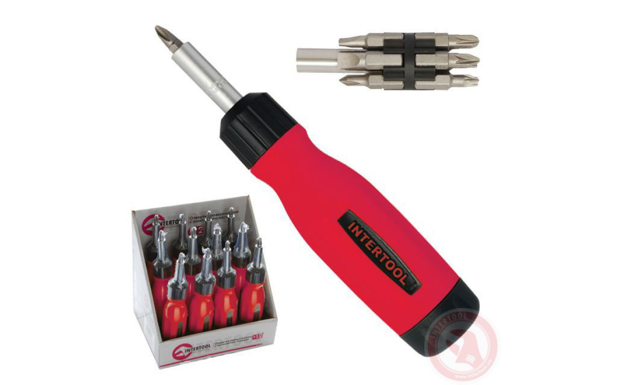 Отвертка реверсивная с комплектом насадок 12 ед INTERTOOL VT-1003 занимает достойное место по соотношению цена-качество, т.к. сделана из хорошего материала и имеет невысокую цену.