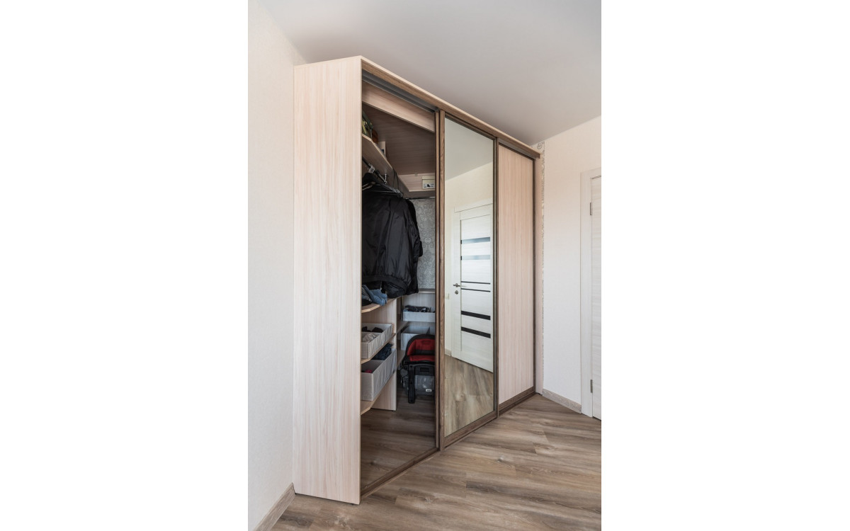 Небольшие гардеробные комнаты, с раздвижными дверями и зеркальными фасадами, отличная альтернатива стандартному шкафу купе. Подобная модель шкафа, позволяет более рационально использовать свободное место в помещении и лучше организовать систему хранения ваших вещей и обуви. А наличие раздвижной системы, значительно упрощает доступ в любую точку шкафа.