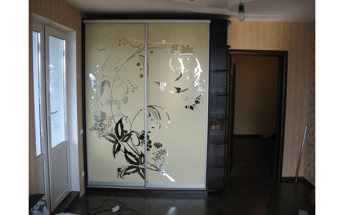 Такой шкаф купе, относится к разряду универсальной мебели. Его габариты, форма и внутренне наполнение прекрасно подойдут для любой из комнат. В нем есть все необходимое – штанга для вешалок, полки для трикотажных вещей и выдвижные ящики для белья или других мелочей. А неброский, но элегантный рисунок, выполненный краской на зеркале, прекрасно впишется в любой интерьер и чудесно его дополнит.
