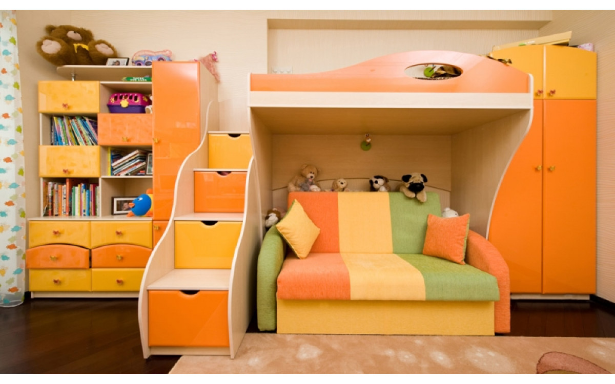 Яскравий набір меблів для дитячої кімнати, виконаний у теплих тонах з використанням МДФ фасадів покритих глянсовим ПВХ покриттям. Оригінальний проект передбачає розташування додаткового спального місця та велику кількість місць зберігання та декоративних елементів.