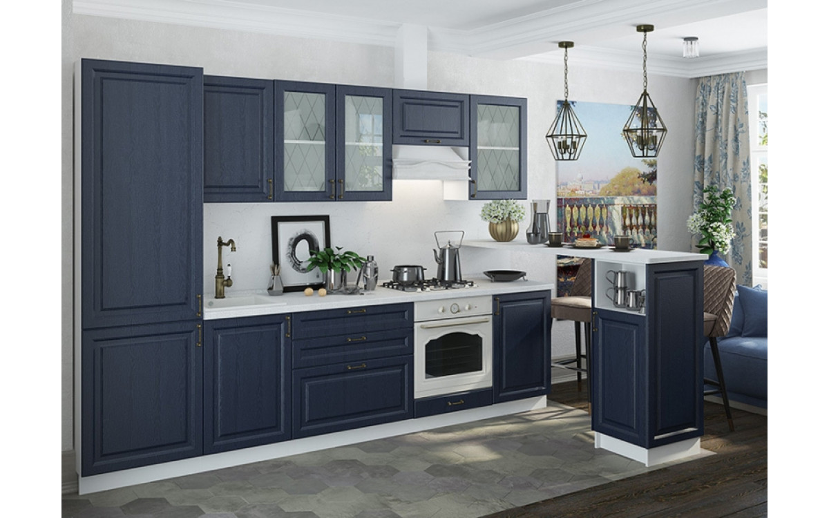 Суворий та лаконічний дизайн, оригінальне колірне рішення, натуральність дерев'яних фасадів, непомітні але дуже привабливі вітражі, кам'яна стільниця та наявність зручної барної стійки – все це приковує погляд та не зможе вас залишити байдужими. Достатньо один раз побачити це оригінальний кухонний гарнітур, і Ви закохаєтеся в нього серйозно та довго.
