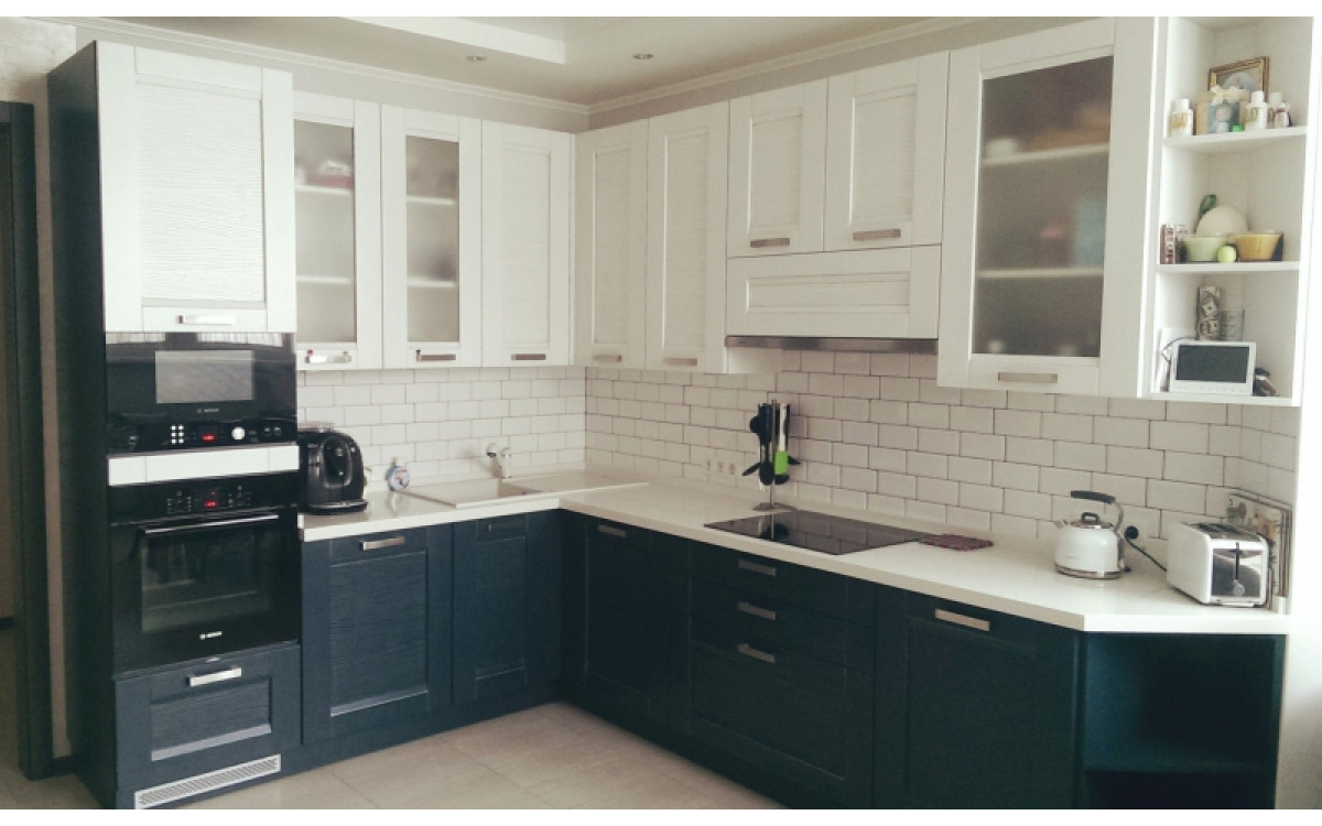 Оригінальна і сувора кутова кухня c стільницею зі штучного каменю, що не терпить нічого зайвого, повинна припасти до смаку серйозним і впевненим у собі людям, які цінують стабільність, надійність і комфорт. Сучасна форма дерев'яних фасадів надає відчуття надійності, а контрастне поєднання кольорів масиву натурального дерева і декору каменю, тільки посилюють це відчуття.