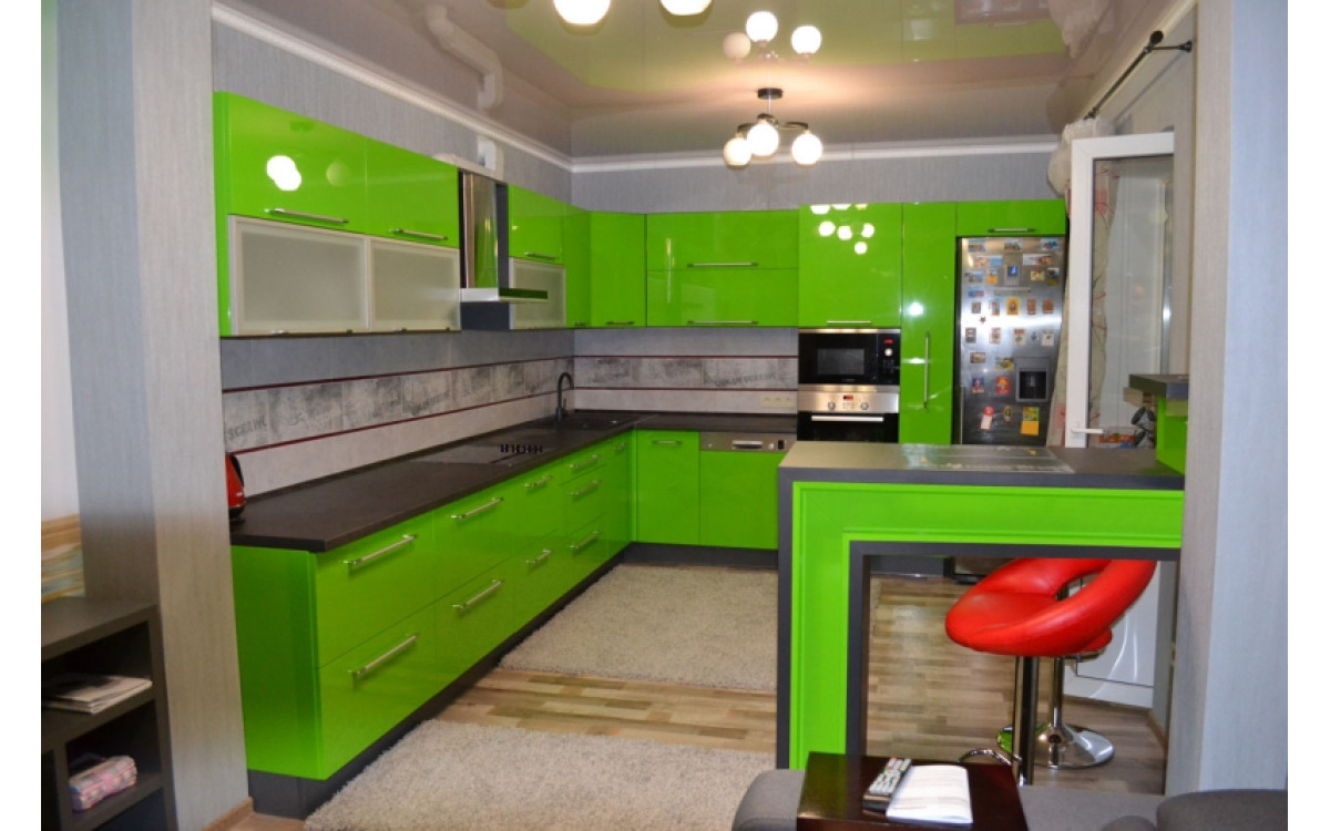 Дуже яскрава і насичена кольором кухня з фарбованими глянцевими МДФ фасадами, чорної стільницею і зручною барною стійкою. Ця кухня, є прикладом ідеального проектування меблів для кухні з урахуванням індивідуальних особливостей приміщення, побажань замовника, функціональності і практичності. Фасади нижнього ряду верхніх модулів, в алюмінієвому профілі з матовим склом, що надає кухні легкості і робить яскравий декор глянцевих фасадів менш нав'язливим. У цьому гарнітурі, безліч висувних ящиків, підйомних механізмів і містке максі карго в пеналі з вбудованою технікою, це робить організацію зберігання більш зручним і практичним.