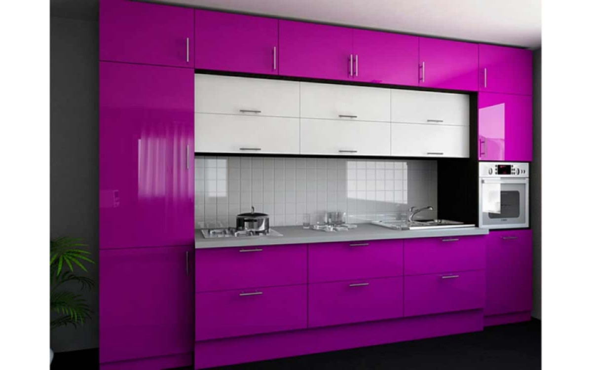Помітний, яскравий і оригінальний кухонний гарнітур, з глянцевими фарбованими МДФ фасадами, світлої стільницею і верхніми модулями різної глибини, з монтажем під стелю, ідеально підходить для невеликої кухні. Правильна геометрія, симетричне розташування тумб, пенали з вбудованої побутової технікою з боків, велика кількість висувних ящиків прихованого монтажу і підйомних механізмів від фірми Rejs, говорять про добре спланований і продуманий дизайн проект. А контрастно підібрані кольори фасадів і того ж кольору скіналі, підкреслюють оригінальний і витончений смак господарів.