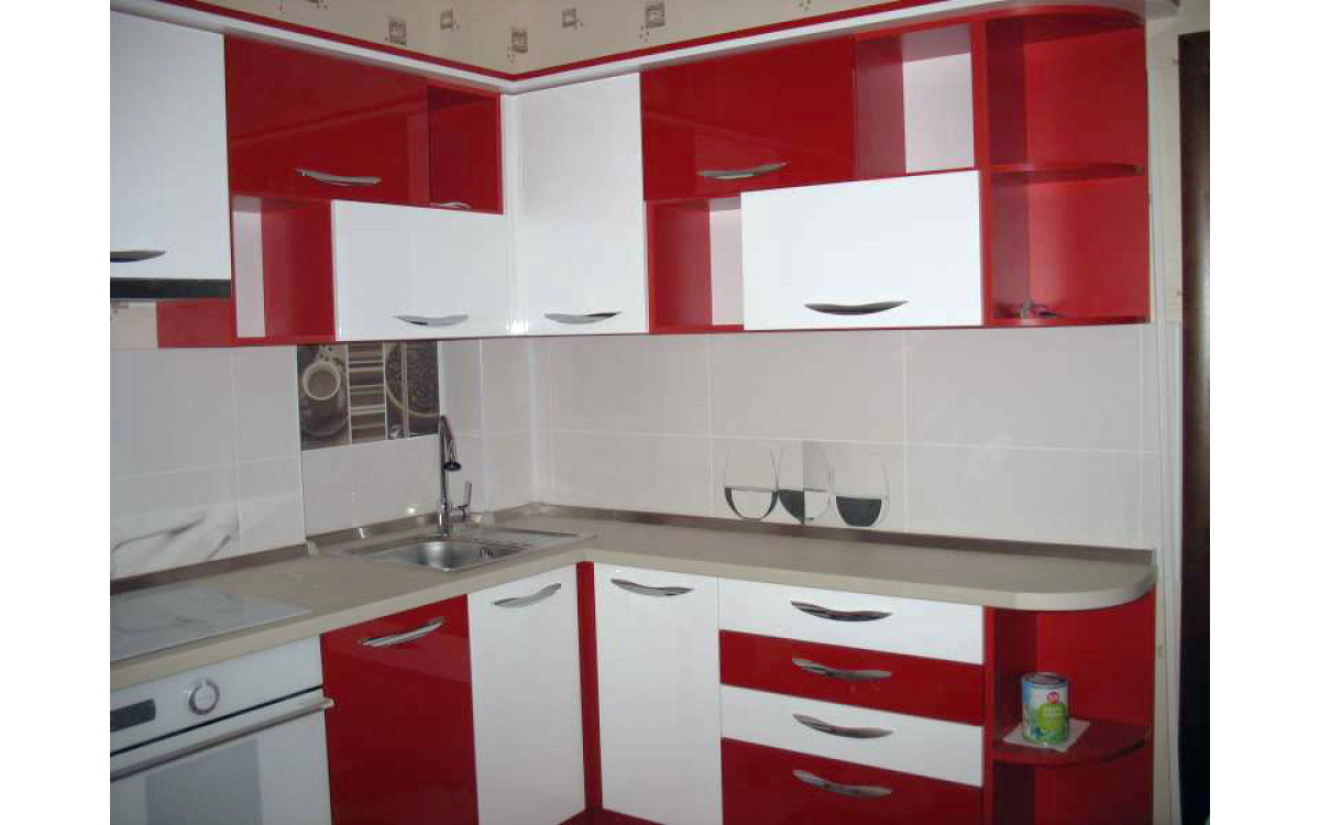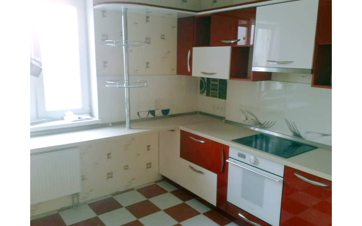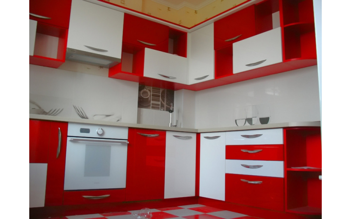 Дуже яскрава, насичена і зовсім незвичайна сучасна кухня в стилі Модерн, виготовлена з урахуванням індивідуальних особливостей приміщення. Червоний і білий глянець фарбованих МДФ фасадів і білий корпус, прекрасно відображають весь навколишній інтер'єр приміщення, збільшуючи простір, а сама колірна гамма, безліч відкритих ніш, асиметричні модулі, підібрана в колір побутова техніка і подобу барної стійки - створюють відчуття свята. Якщо ви любите меблі з оригінальним і незвичайним зовнішнім виглядом, то ця виразно Вам припаде до душі. А надійна фурнітура, від кращих європейських виробників зробить термін служби довгим і комфортним.