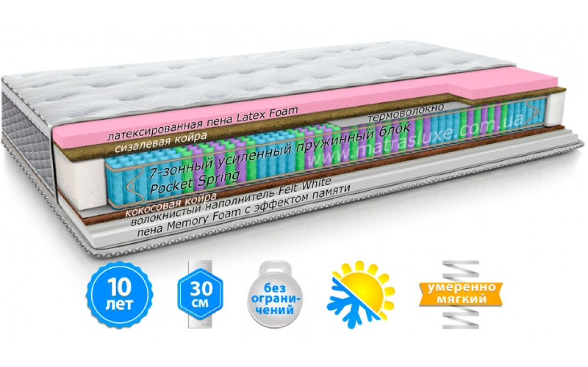 - Наповнення:Чохол - стрейч жаккард глибокої прошивки Прошивка чохла - бавовна 100% Latex Foam сизаль Термоволокно 7 зонний пружинний блок Pocket Spring з посиленням двома рамками зі сталі Termofiber кокосова койра Felt White Memory Foam (Піна пам'яті) Прошивка чохла - шерсть 100% Чохол - стрейч жаккард глибокої прошивки