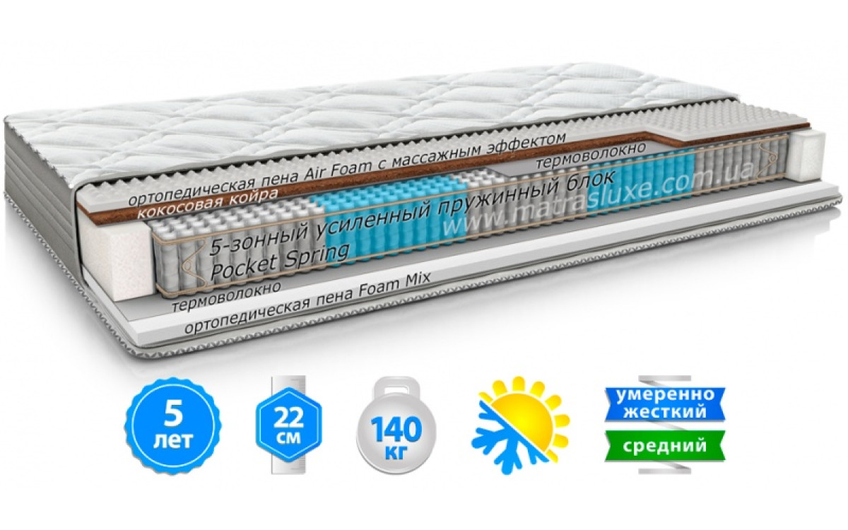 - Наповнення:Чехол - стрейч жаккард глубокой прошивки Прошивка чехла – хлопок 100 % Air Foam Кокосовая койра Termofiber 5 зонный пружинный блок Pocket Spring с усилением двумя рамками из стали Termofiber Foam mix Прошивка чехла – шерсть 100% Чехол - стрейч жаккард глубокой прошивки