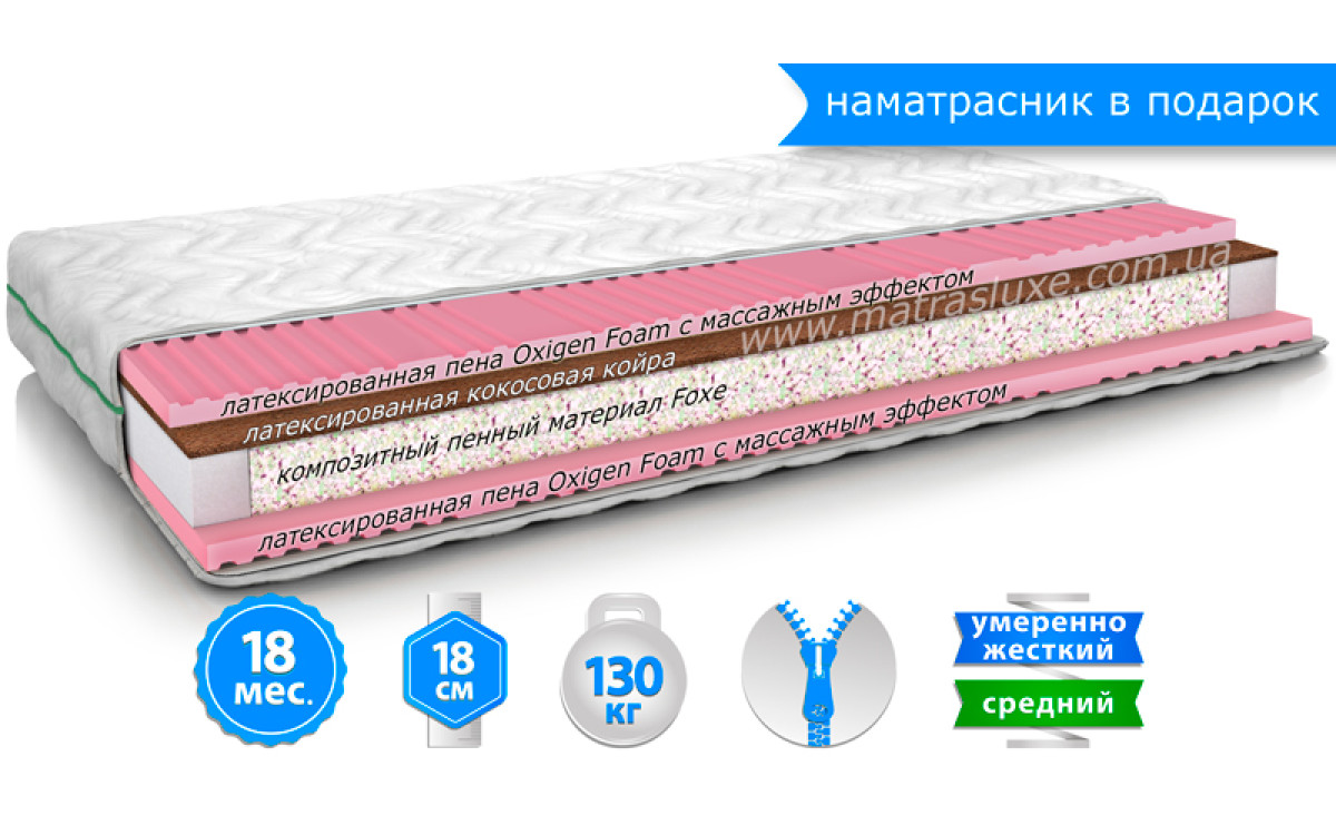 - Наповнення:Чохол знімний - стрейч-жаккард глибокої прошивки Піна Oxigen Foam (латексована з масажним ефектом) кокосова койра Моноблок спіненого матеріалу Foxe Піна Oxigen Foam (латексована з масажним ефектом) Чохол знімний - стрейч-жаккард глибокої прошивки
