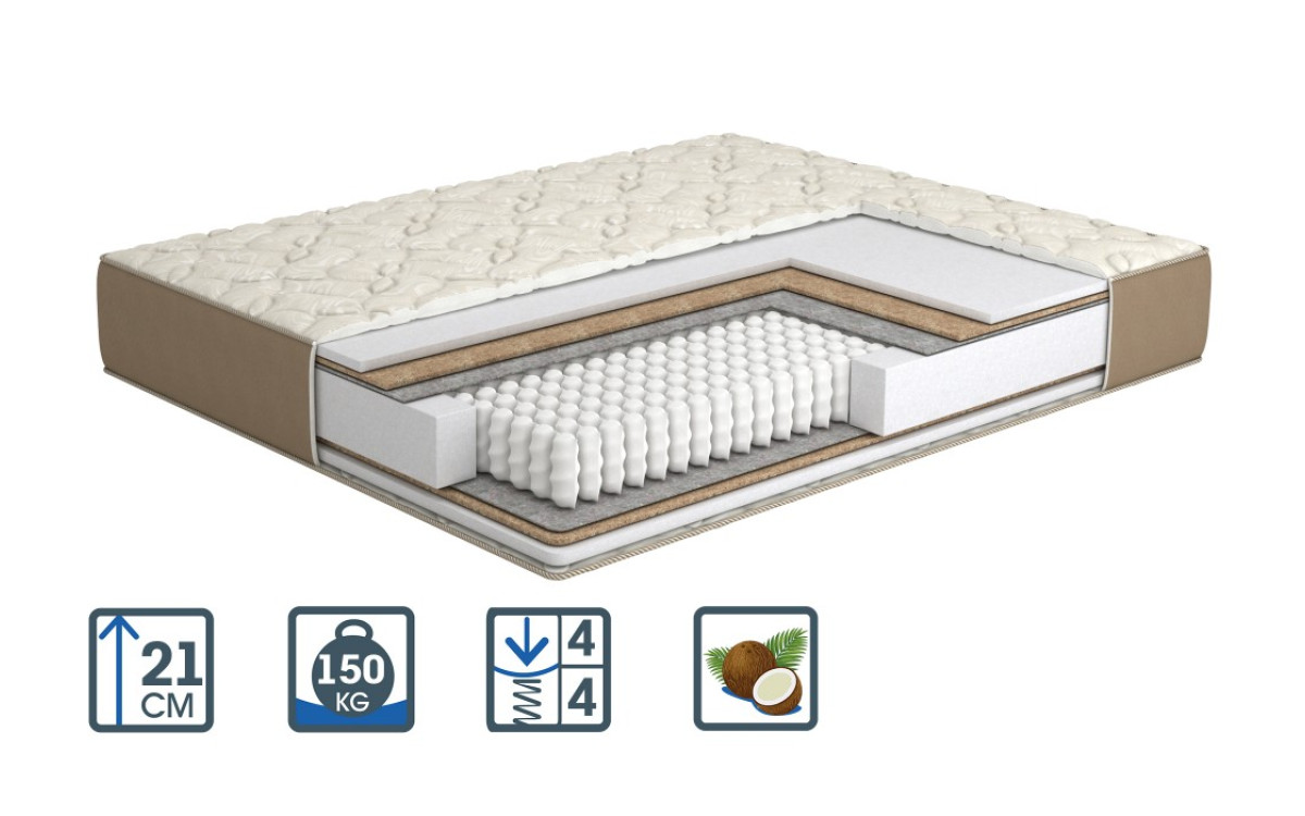 - Наповнення:Чохол - жаккард глибокої прошивки Air Foam - інноваційний матеріал кокосова койра Termofiber Посилений блок незалежних пружин Pocket Spring з металевою рамкою в двоспальних моделях Termofiber кокосова койра Air Foam - інноваційний матеріал Чохол - жаккард глибокої прошивки