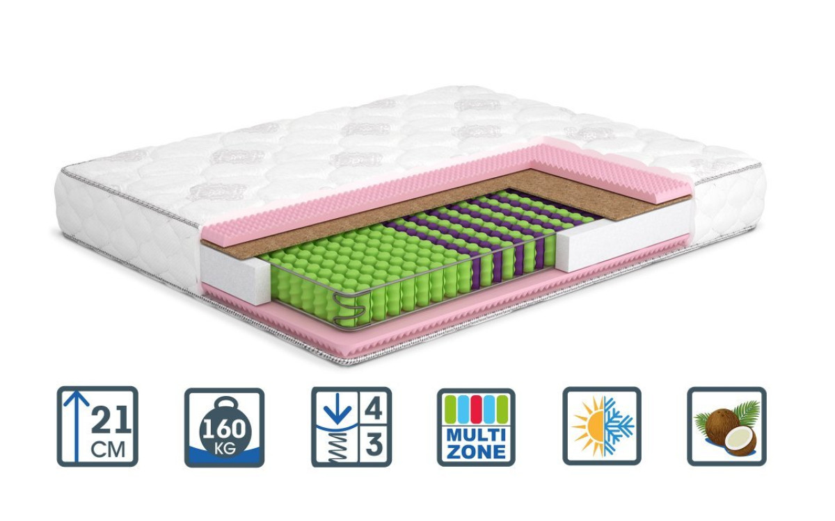 - Наповнення:Чохол - стрейч-жаккард глибокої прошивки Прошивка чохла - шерсть Штучний латекс Latex Foam з ефектом мікромасажу кокосова койра Захисний шар термоволокна Семізонний блок незалежних пружин Multi Pocket, скріплений по периметру подвійною рамою з прокатної сталі Захисний шар термоволокна Штучний латекс Latex Foam з ефектом мікромасажу Натуральний латекс з ефектом мікромасажу Прошивка чохла - бавовна Чохол - стрейч-жаккард глибокої прошивки