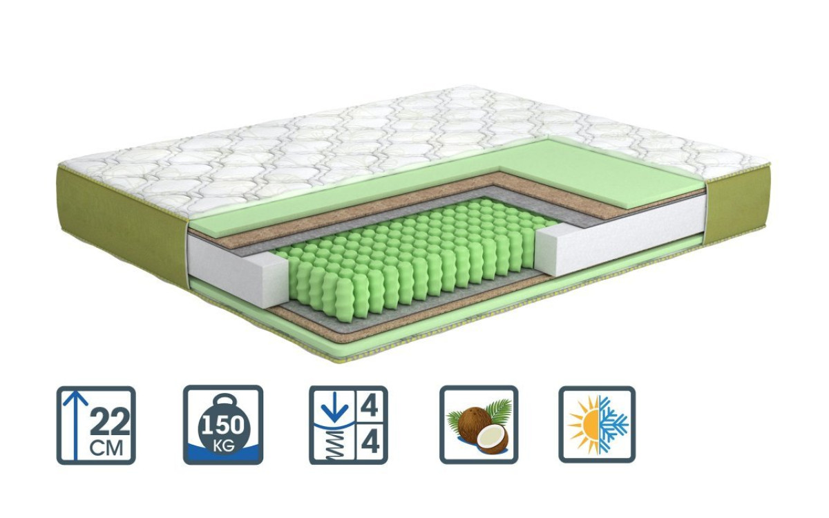 - Наповнення:Чохол - жаккард прошитий льоном Латексована піна Latex Foam Green Special кокосова койра Termofiber Незалежний пружинний блок Anatomy Spring System із збільшеною кількістю пружин (320 шт. На квадратний метр) Збільшений в два рази по товщині Єврокаркас для додання міцності краях матраца Termofiber кокосова койра Латексована піна Latex Foam Green Special Чохол - жаккард прошитий льоном
