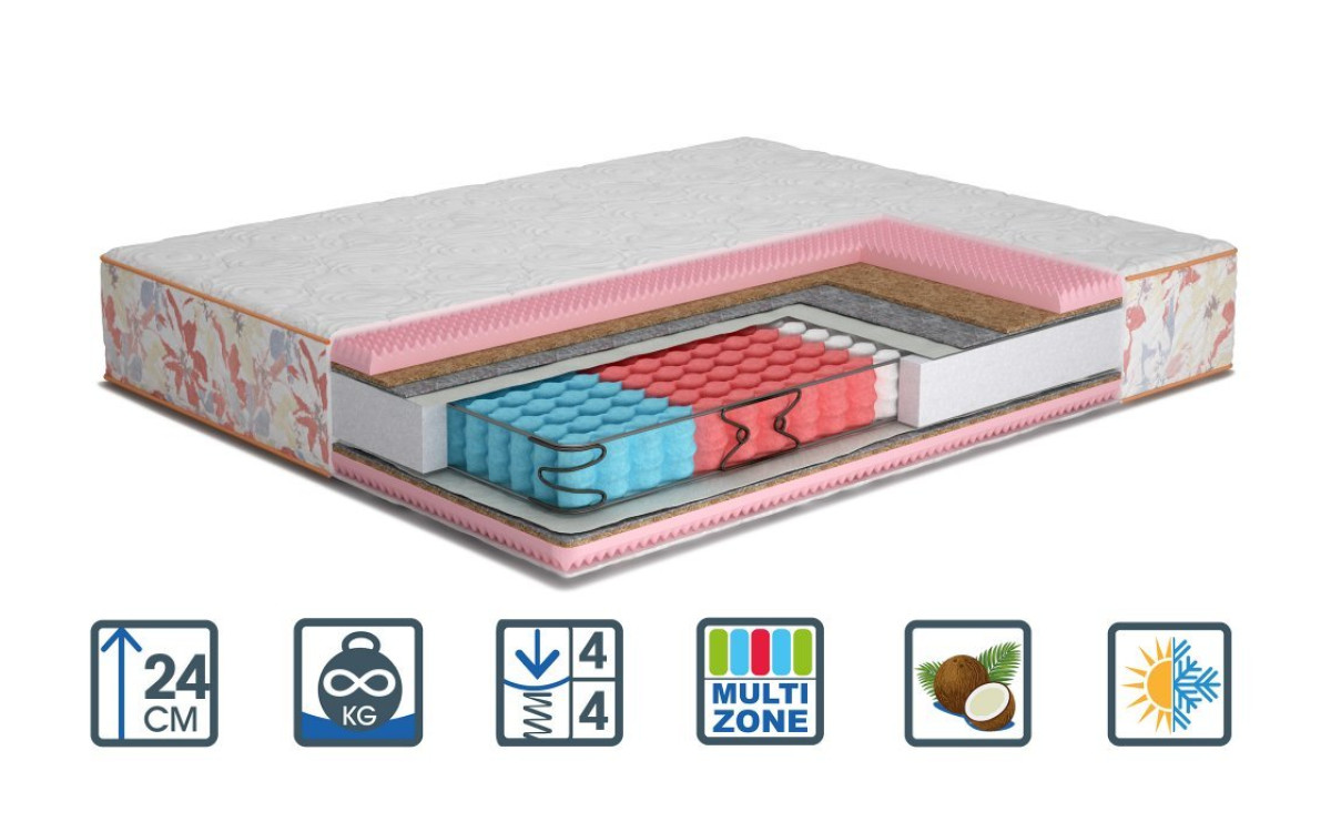 - Наповнення:Чохол - стрейч жаккард глибокої прошивки Прошивка - Шерсть Oxigen Foam кокосова койра Termofiber 5 зонний пружинний блок Pocket Spring з посиленням двома рамками зі сталі Termofiber кокосова койра Oxigen Foam Прошивка - Бавовна Чохол - стрейч жаккард глибокої прошивки