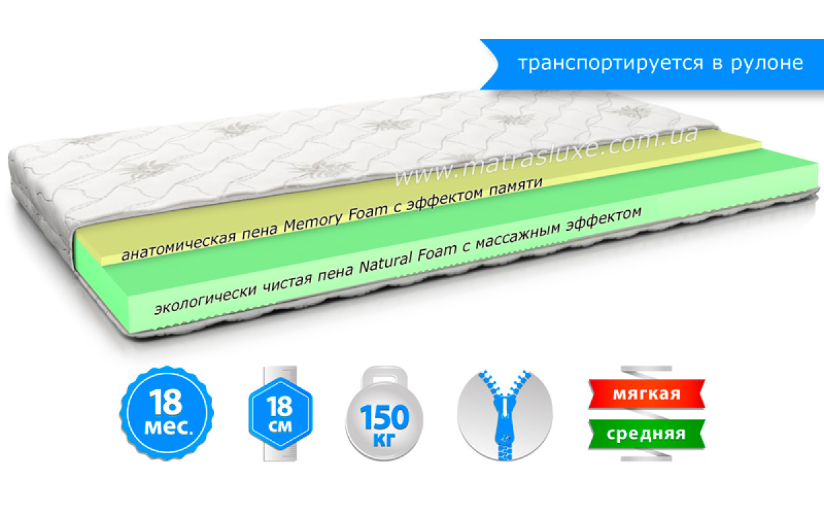 - Наповнення:Чохол знімний - стрейч-жаккард глибокої прошивки Піна Memory Foam з ефектом пам'яті Піна Natural Foam з масажним ефектом Чохол знімний - стрейч-жаккард глибокої прошивки