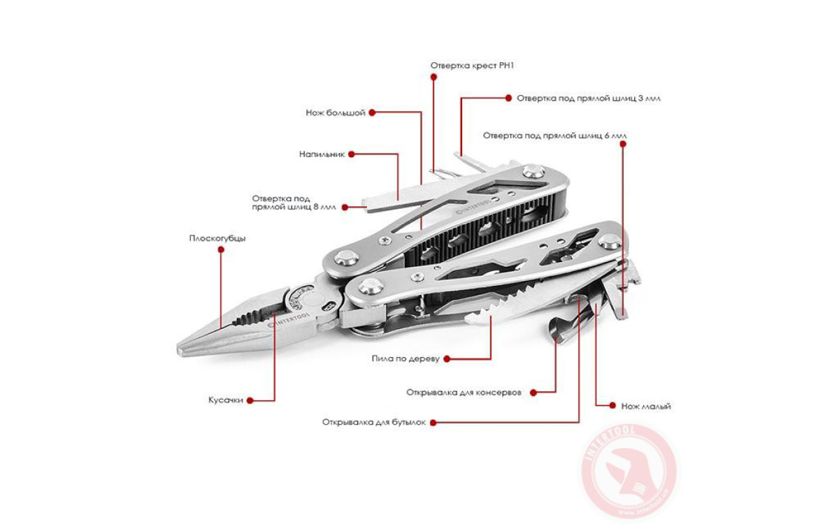 Мультиинструмент 12 в 1 с чехлом INTERTOOL HT-0540 занимает достойное место по соотношению цена-качество, т.к. сделано из хорошего материала и имеет невысокую цену.