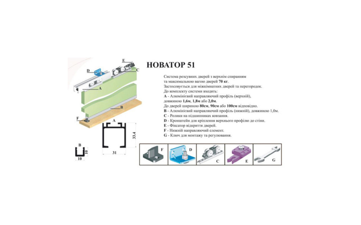Новатор 51 - це досить популярна розсувна система для міжкімнатних дверей верхнього спирання, що складається з набору роликів, здатних без поломок прослужити тривалий час, і профілю виготовленого з алюмінію, яка підходить для використання 4-х підвісних полотен вагою до 70кг. Для установки системи Новатор 51 немає необхідності в наявності спеціальних навичок та інструментів. Існує можливість застосування навісного рейки номінальною довжиною до 6 метрів. У базову комплектацію входить напрямна певного розміру, кронштейн для її кріплення, нижній профіль, прапорець, фіксатор відкриття дверного полотна, комплект роликів на одні двері і ключ для монтажу і регулювання.