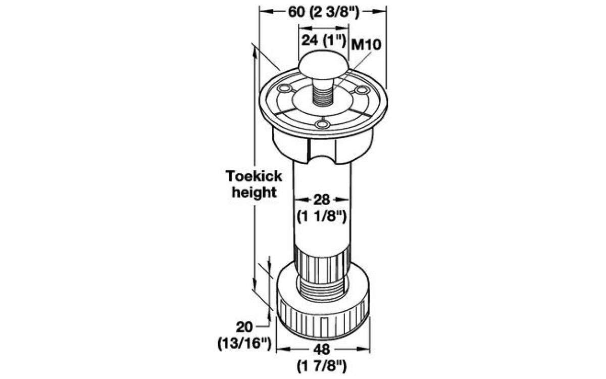 Нога кухонні H = 100 Scilm (опора регульована) 280R27010SF призначена для регулювання вбудованої кухні за рівнем при деякій кривизни опорної поверхні. Цей виріб витримує достатнє навантаження і регулює висоту в великому діапазоні. Також для кухонних ніг розроблена система кріплень до цоколю.