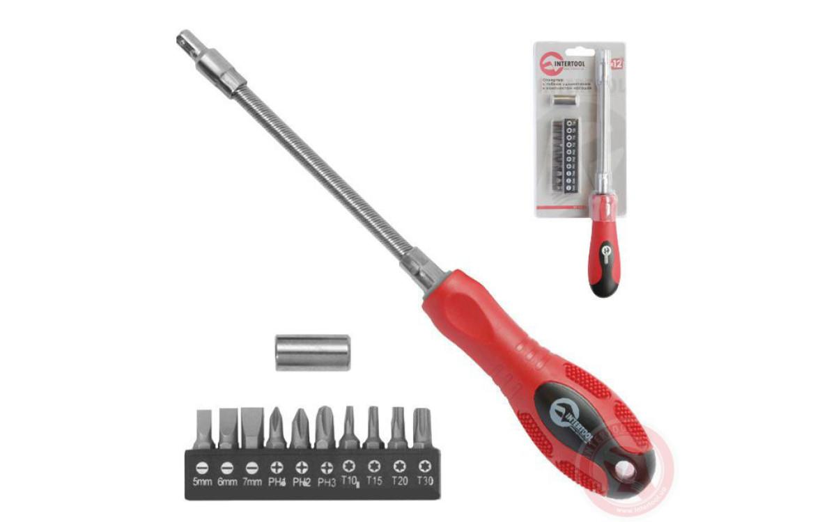 Отвертка с гибким удлинителем и комплектом насадок 12 ед. INTERTOOL VT-1012 занимает достойное место по соотношению цена-качество, т.к. сделана из хорошего материала и имеет невысокую цену.