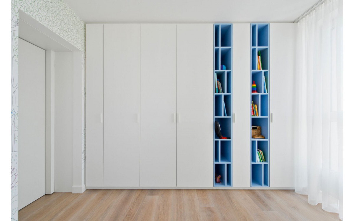 Оригінальна модель з дверима різної ширини, що поєднує в собі традиційну гардеробну шафу з місцем для зберігання книг, сувенірів і різних декоративних дрібниць, чудово підійде для квартир студій. Шафа виготовлена на замовлення та її розміри точно відповідаю розмірам стіни, а внутрішнє наповнення, повністю відповідає всім вимогам замовника з урахуванням особливостей гардеробу та звичок в організації системи зберігання.