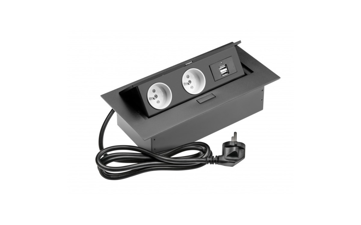 Розетка вбудована для офісу на 2 розетки French с заземленням, 2xUSB с проводом чорна AE-PBU2GU-20 допоможе позбутися від зайвих проводів на робочому місці. Подовжувач встановлюється в стільницю і повністю топиться в неї, коли не використовується. Як тільки виникає необхідність підключити який-небудь електроприлад, вбудований розетковий блок витягується назовні легким рухом і дає можливість підключити до мережі ваш гаджет. За своєю суттю - це повноцінне багатофункціональний пристрій.
