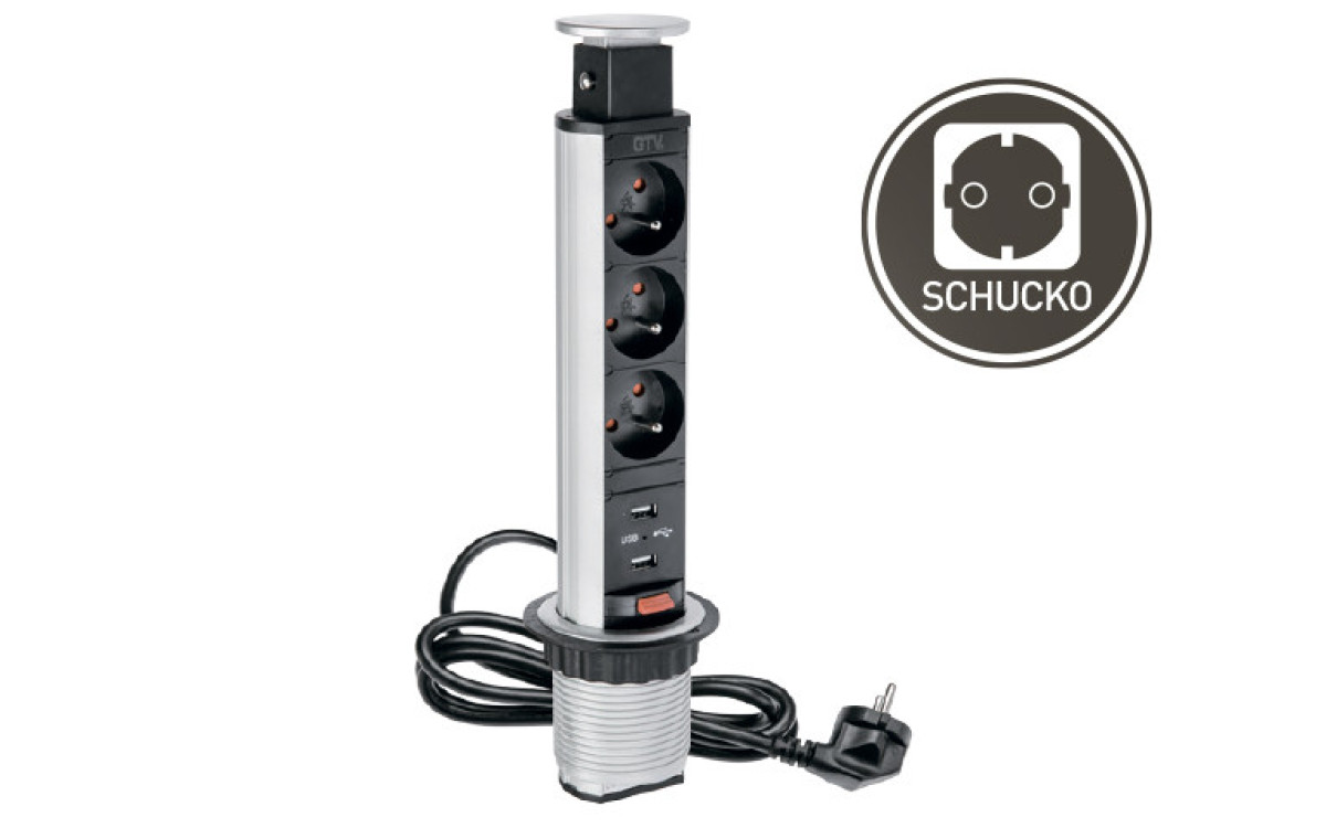 Подовжувач врізний для офісу d 60 із заземленням SCHUCKO на 3 розетки, 2xUSB сірий допоможе позбутися від зайвих проводів на робочому місці. Подовжувач встановлюється в стільницю і повністю топиться в неї, коли не використовується. Як тільки виникає необхідність підключити який-небудь електроприлад, вбудований розетковий блок витягується назовні легким рухом і дає можливість підключити до мережі ваш гаджет. За своєю суттю - це повноцінний багатофункціональний пристрій.