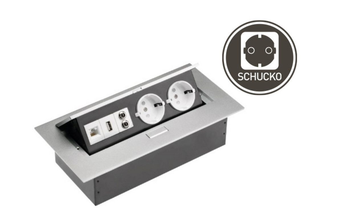 Розетка вбудована для офісу на 2 розетки SCHUCKO с заземленням, USB, аудіо, інтернет вихід алюміній AE-PB02GS-53 допоможе позбутися від зайвих проводів на робочому місці. Подовжувач встановлюється в стільницю і повністю топиться в неї, коли не використовується. Як тільки виникає необхідність підключити який-небудь електроприлад, вбудований розетковий блок витягується назовні легким рухом і дає можливість підключити до мережі ваш гаджет. За своєю суттю - це повноцінне багатофункціональний пристрій.