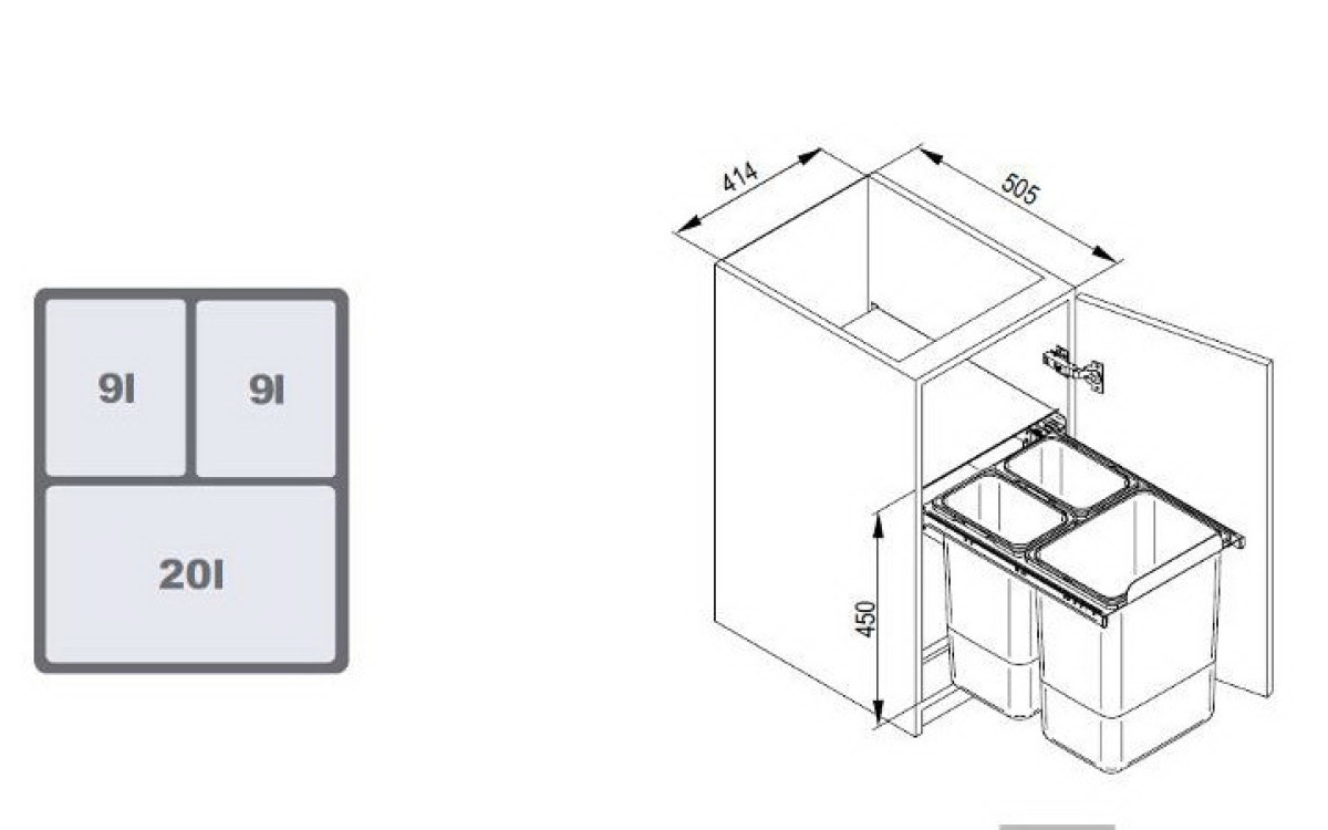 складається з секції з двома відрами для сміття, об'ємом 9л і 20л.